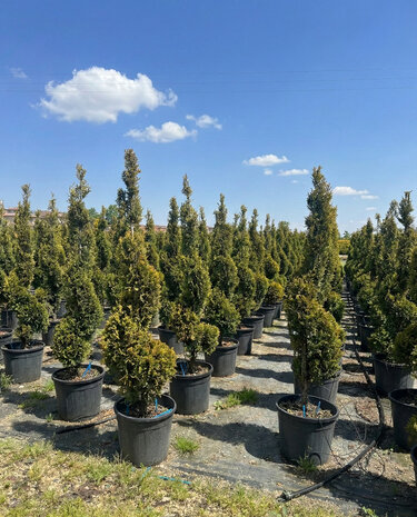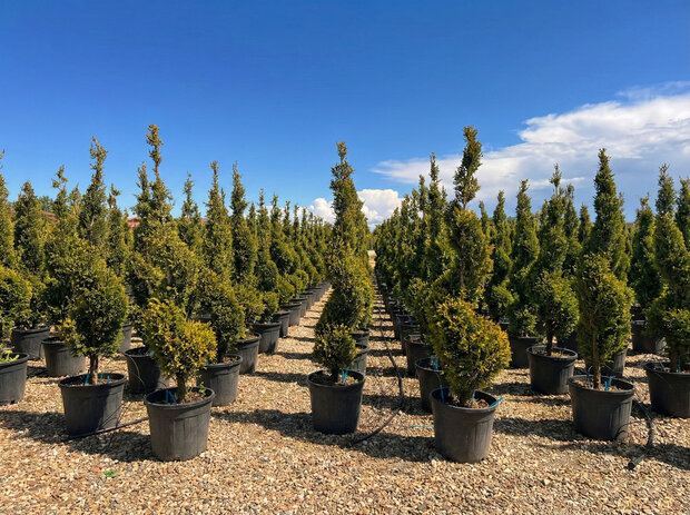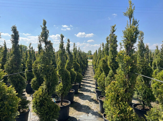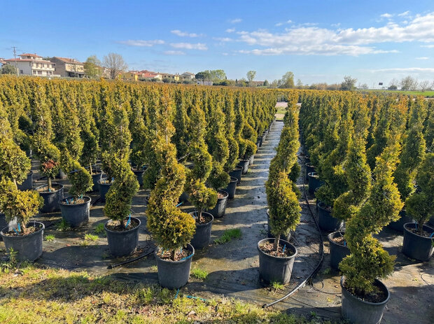 Anmutige Leylandii Spiral von 150 cm mit verspielter Schnittform. Winterhart bis -16 °C und ideal als luxuriöser Blickfang im Garten oder auf der Terrasse.