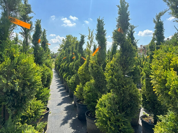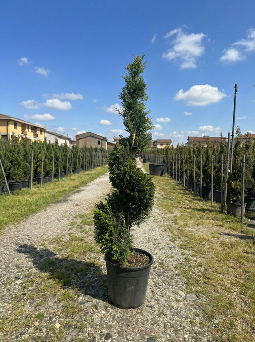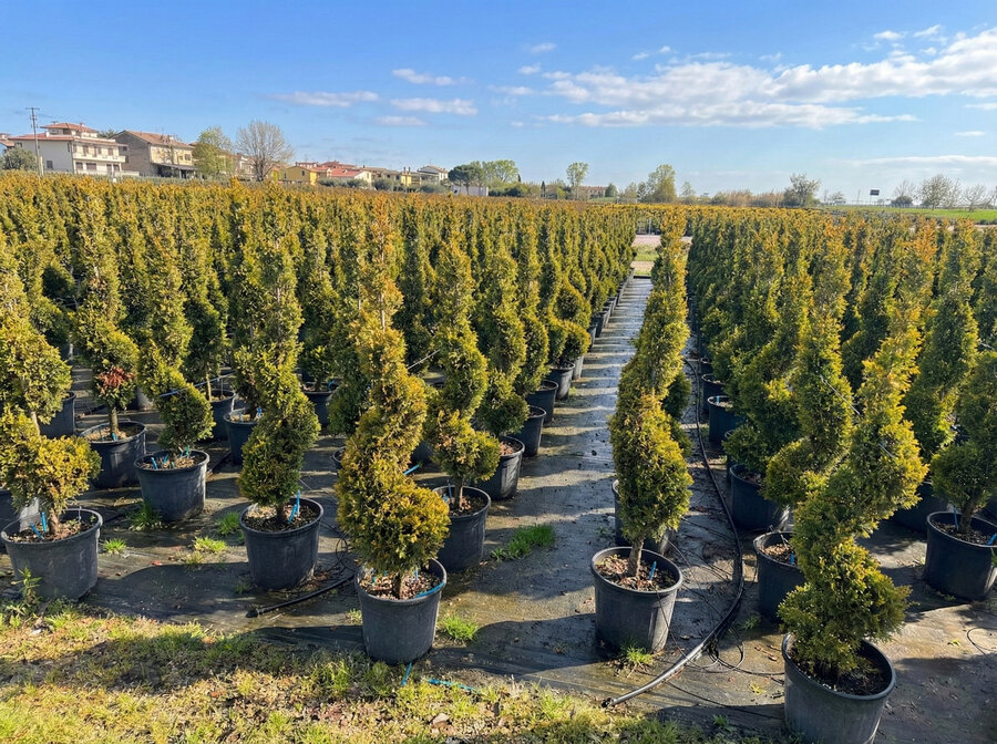 Die Cupressocyparis Leylandii – Spirale ist eine elegant geschnittene Konifere mit exklusiver Ausstrahlung. Die dekorative Spiralform verleiht Gärten und Terrassen eine moderne, architektonische Optik und setzt stilvolle Akzente im Eingangsbereich oder entlang von Wegen.