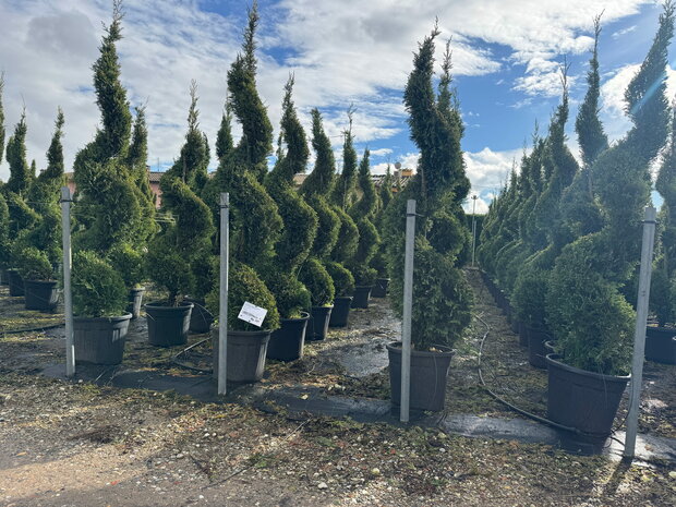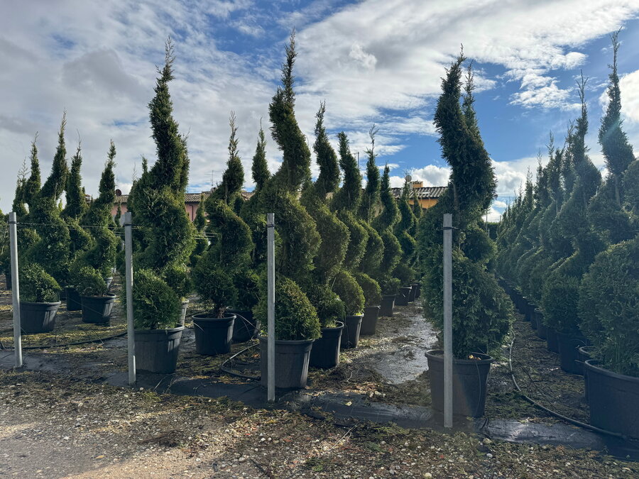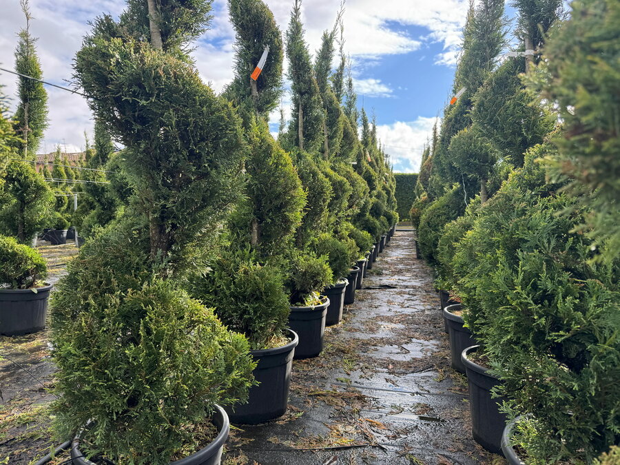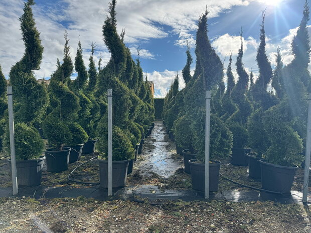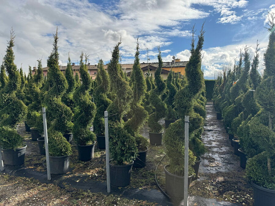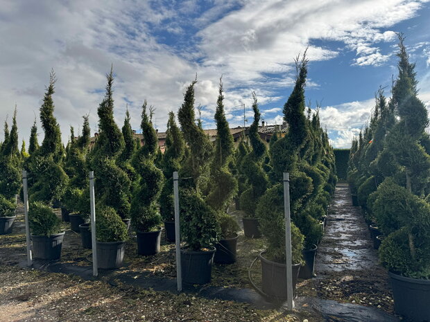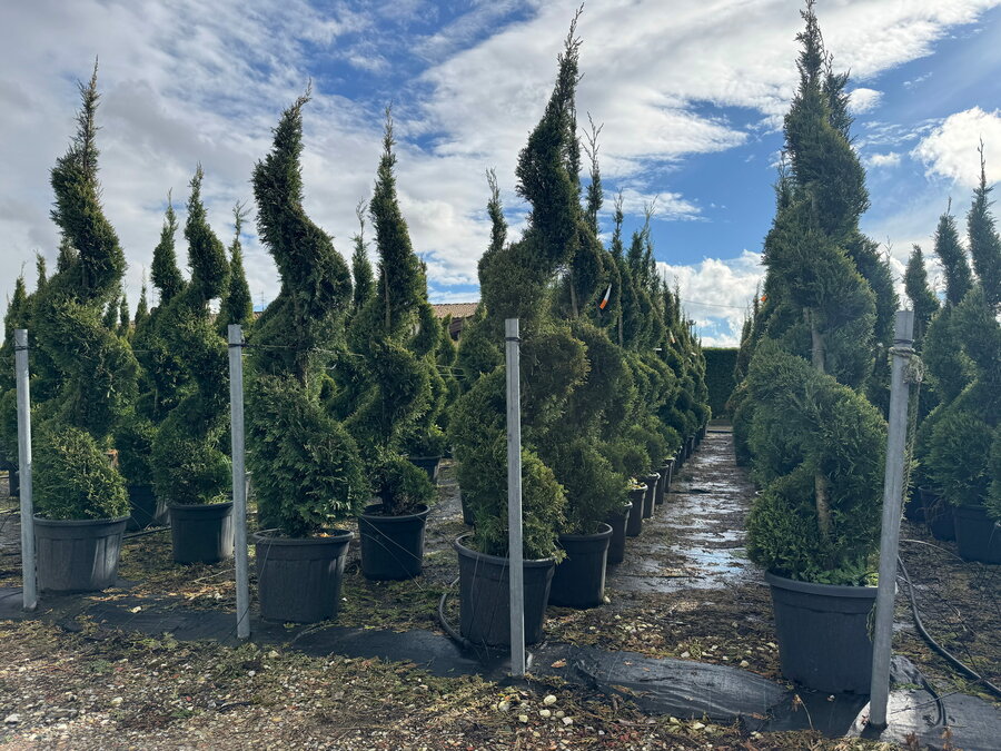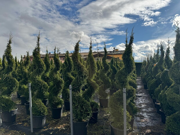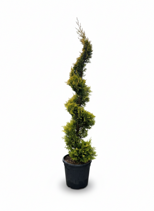 Die Cupressocyparis Leylandii – Spirale ist eine elegant geschnittene Konifere mit exklusiver Ausstrahlung. Die dekorative Spiralform verleiht Gärten und Terrassen eine moderne, architektonische Optik und setzt stilvolle Akzente im Eingangsbereich oder entlang von Wegen.