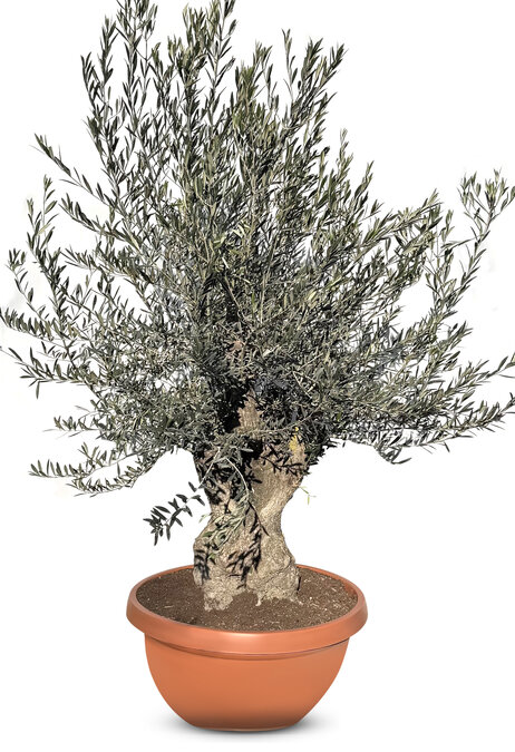 Dieser Olivenbaum Bonsai hat einen robuste, natürlich geformten Stamm, der mit der Zeit eine wunderschöne verwitterte Struktur entwickelt hat. Die Kombination aus grauer Rinde, silbrig-grünen Blättern und dekorativer Schale macht diesen Baum zu einem Blickfang in modernen und klassischen Gärten.