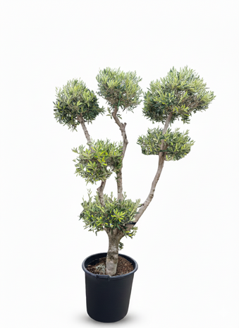 Die Olea Europaea Pom Pon ist ein einzigartiger und stilvoller Olivenbaum mit einem verspielten Charakter. Die verschiedenen „Wolken“ aus Blättern auf den Ästen verleihen dem Baum ein elegantes Aussehen, was diese Sorte zu einem perfekten Blickfang im Garten, auf der Terrasse oder am Eingang macht. Mit seiner anmutigen Form und mediterranen Ausstrahlung bringt dieser Baum sofort eine südliche Atmosphäre in Ihren Außenbereich. Der Pom Pon Olivenbaum ist nicht nur dekorativ, sondern auch winterhart und pflegeleicht.