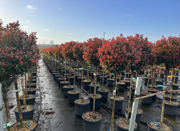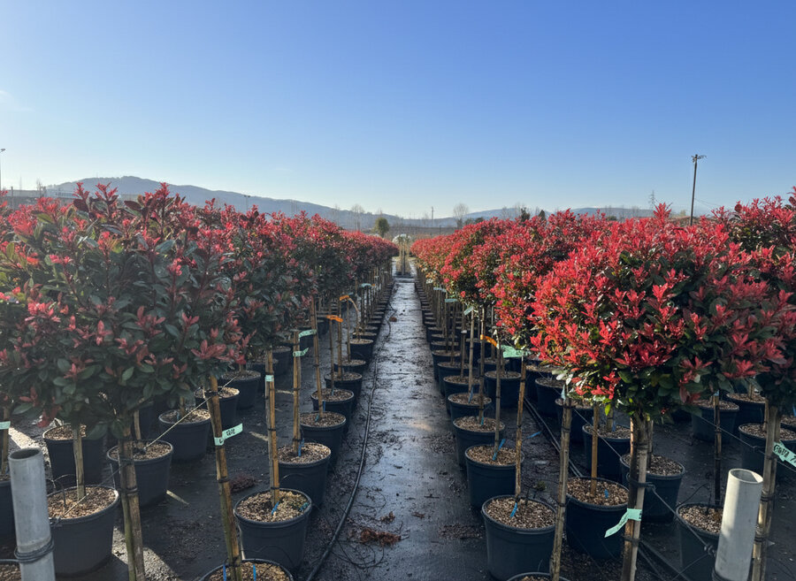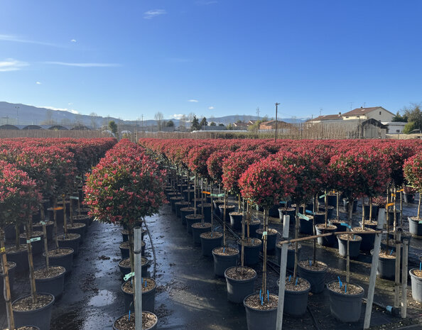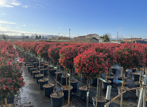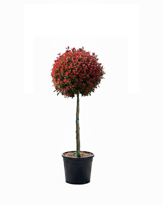 Mit einer Gesamthöhe von ca. 120 cm inklusive 18-Liter-Topf eignet sich diese Photinia hervorragend für kleinere Gärten, Vorgärten oder als dekorativer Kübelbaum. Die kugelförmige Krone auf Stamm sorgt für eine gepflegte und moderne Optik.