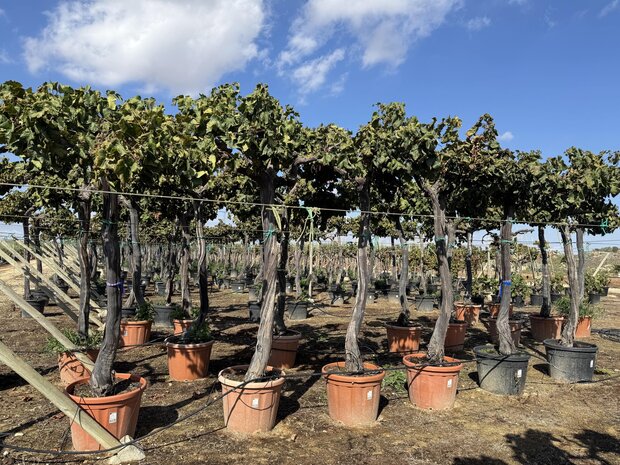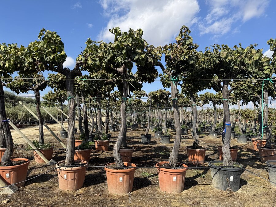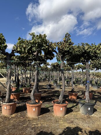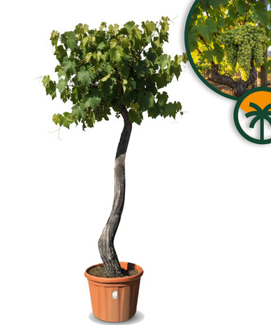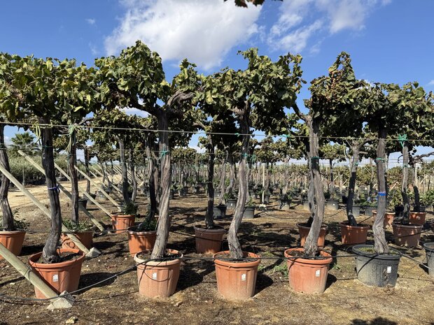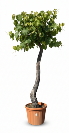 Dieser Weinbaum vereint einen kompakten Stamm mit einer üppigen Krone aus grünen Blättern und köstlichen Früchten. Er eignet sich perfekt als solitärer Blickfang oder in Kombination mit anderen mediterranen Pflanzen.